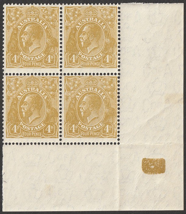 right marginal blk of 4 plated 4R 53-54, 4R 59-60 with variety 'distorted S.E. cnr' (4R60). F fresh MNH, minor marginal perf separation. SG 129(var). ACSC 117A(4)o cat $320 as 4 MNH singles, plus premium MNH variety = $400+. (4). (Image1)
