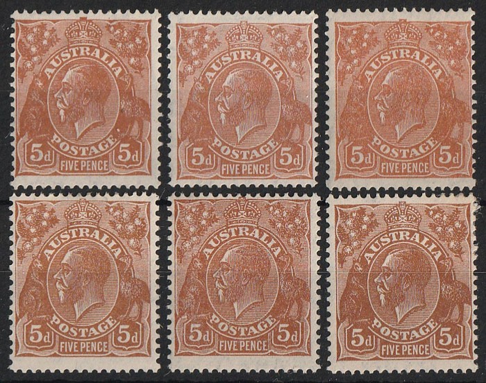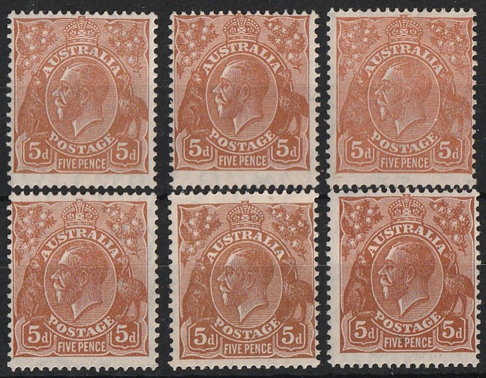yellow-brown, pale to deep shades. Fresh F-VF MLH. SG 130 cat £144. ACSC 127 A/B cat $150. (6) (Image1)
