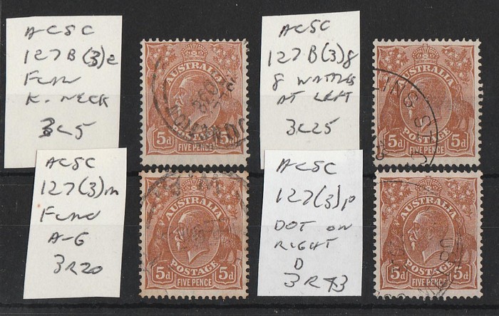 (shades), varieties 3L1 'flaw behind king's neck', 3L7 '8 wattles at left', 2R7 'flaw between A-G', 3R42 'dot on right P'. F-VFU. SG 130(var), ACSC 127A(3)e, g, m, p cat $180. (4)