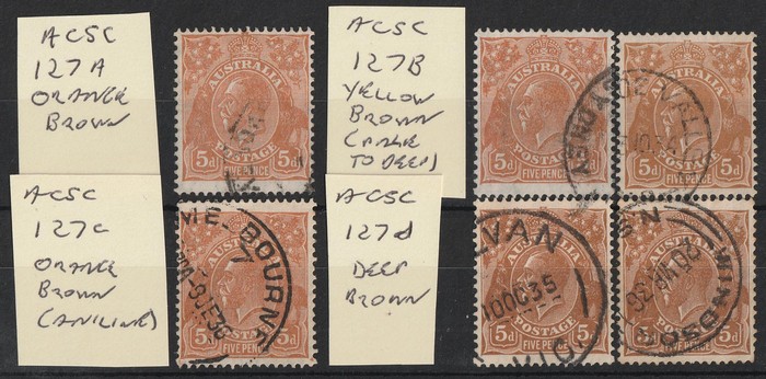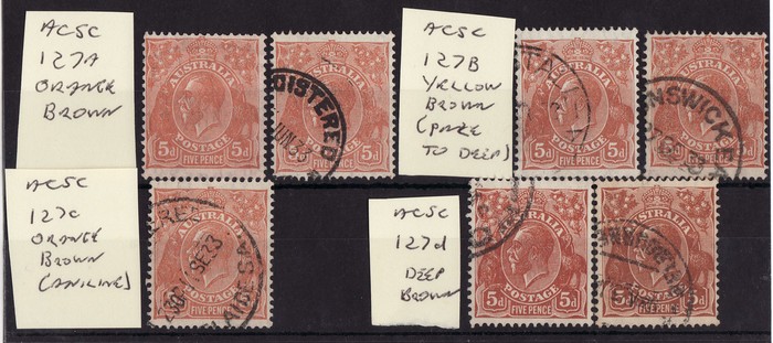 range orange-brown, yellow-brown, orange-brown (aniline) & deep brown, plus sub-shades. F-VFU. SG 130(var), ACSC 127A/B/C/D cat $180+. (7). (Image1)