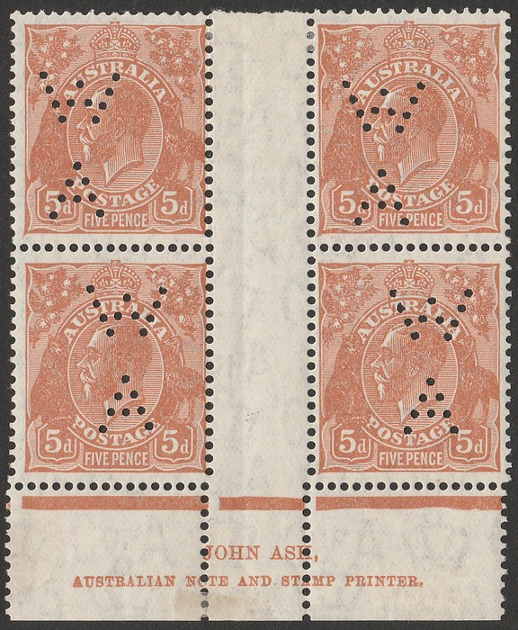 of A wmk Ash Imprint blk of 4, Plate 2 perforated WA for State use. Unusual VF fresh 2 MLH, 2 MNH. SG 130(var), ACSC 127B(2)z(var) $400. (4). (P) (Image1)