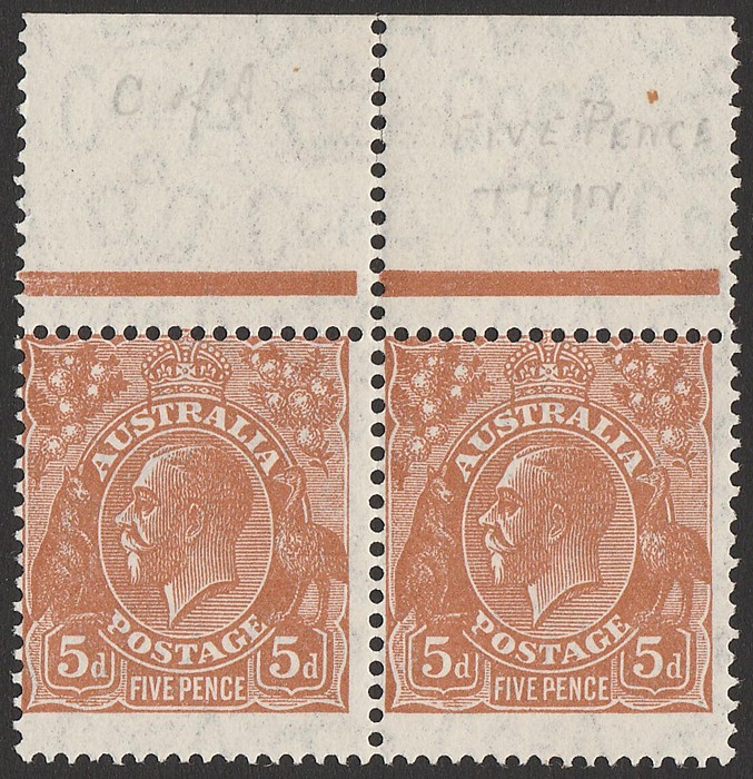 marginal pr 2R3 - R4 with 2R4 showing variety ' thin words of value'. F-VF fresh MNH. SG 130(var), ACSC 127Bh Mint flaw $125, should be at least double, $250 for normal is $290. (2) (Image1)