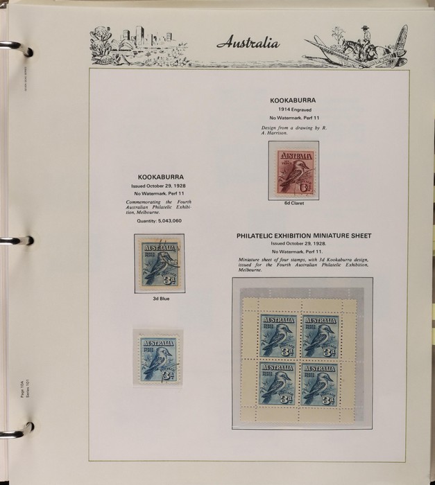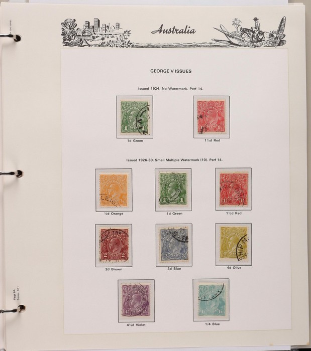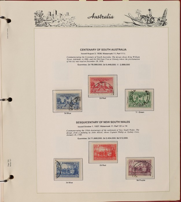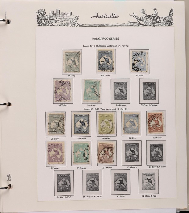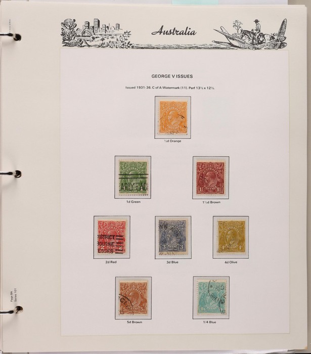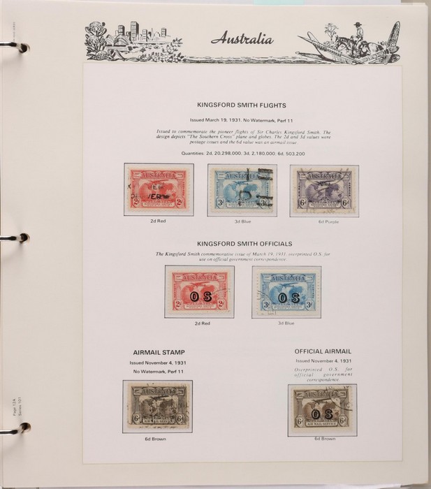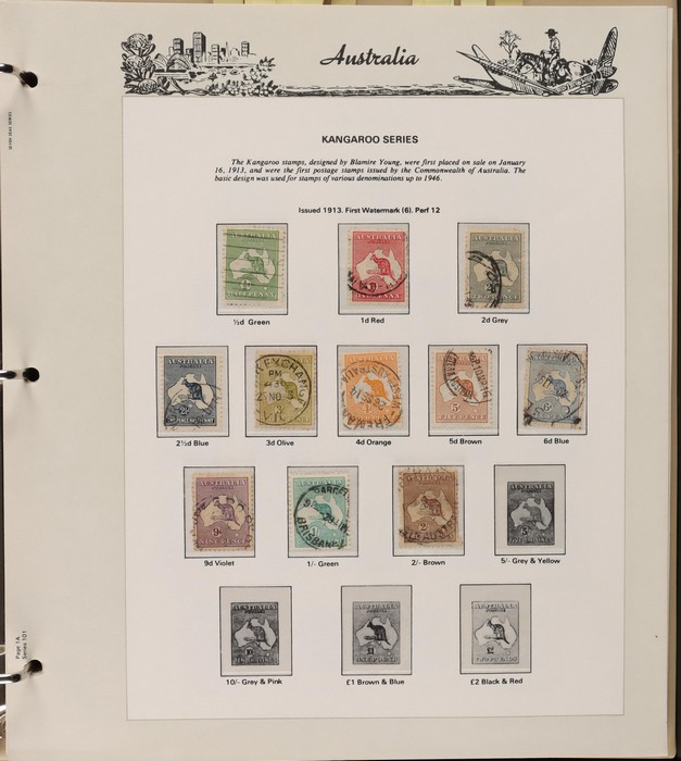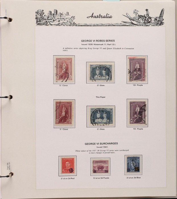 152 1913-65 Used Collection on Seven Seas illustrated hingeless album. Roo's 1st wmk to 5/- (5/- is CTO), 3rd wmk to 5/-, 1st wmk Large OS to 1/-, small OS mixed wmks to 10/- (3rd), KGV single wmk completed to 1/4, small multi perf 14 complete to 1/4, CofA completed t 1/4, various commem sets complete inc 1931 Kingsford Smith set, 1934 Macarthur set, 1935 ANZAC & 1935 Silver Jubilee sets, 1936 South Australia Centenary, 1937 NSW Sesqui set, 1937 Zoological series, mainly complete to £1 thick paper, 1949 Arms set to £2, fairly complete to 1965, 1963 Navigators set to £2 with both papers. GU-VFU. SG cat £3000=A$6000. ACSC cat $5600. (400+).