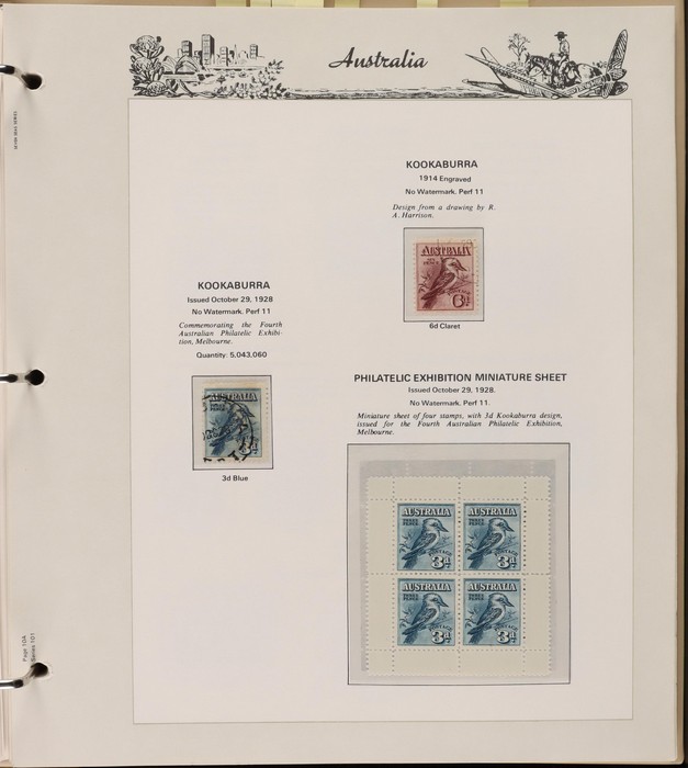 158 image1913-80s collection in Seven Seas album with illustrated hingeless pgs. Inc Kangaroos to 2/- maroon, KGV Heads to 1/4, fairly complete 1935-40 Commemorative sets complete, 1938 Robes 5/- to £1, both paper sets, 1949 Arms 5/- to £2, 1964 Navigators 4/- to £2 set with both papers, sparse in decimals, few errors in classifications. Mainly FU-VFU, about 10% F-MLH. SG cat £1350+ = A$2700. ACSC cat $2200+. Reserved at the replacement cost of the album which is GC (black ink number spine & front). (400+) (Image1) (Image2) (Image3) (Image4) (Image5) (Image6) (Image7)