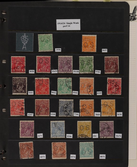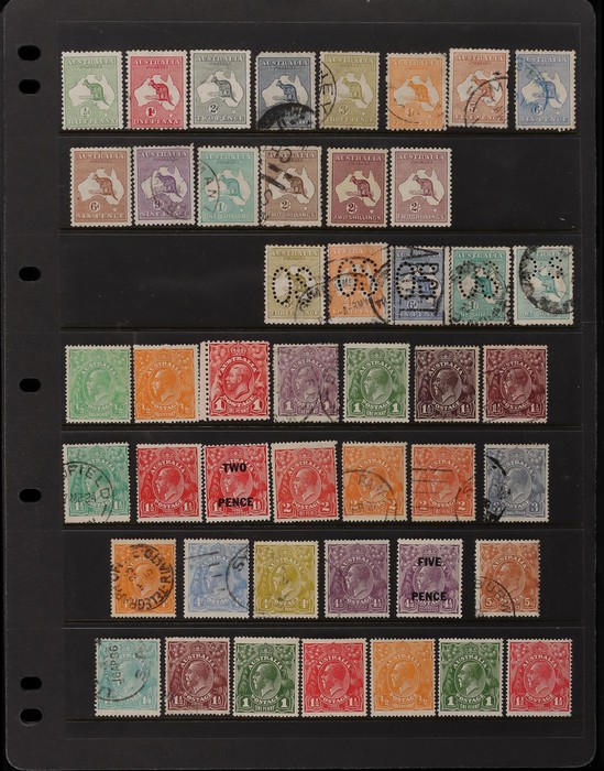 155 1913-70 Collection on Seven Seas pages Roo's mixed wmks, 1st wmk 4d & 5d, CofA wmk 5/- & £1, noted 6d 1st wmk perf Large OS very small stamp caused by double perf, KGV various wmks to 1/4, 1914 6d engraved Kooka, 1930 Commems, 1938 Robes set to £1 thick paper, 10/- is specimen, 1949 Arms to £2, 1964 Navigators set of 6 to £1, some decimals inc 1966-71 set to $4. Postage due's various series to 5/-, some states inc Victoria 1d Half length pr on piece with cancel in pen. Some flts, mostly GU-VFU. SG cat £1300+ = A$2600. ACSC cat $2100+. (500+).