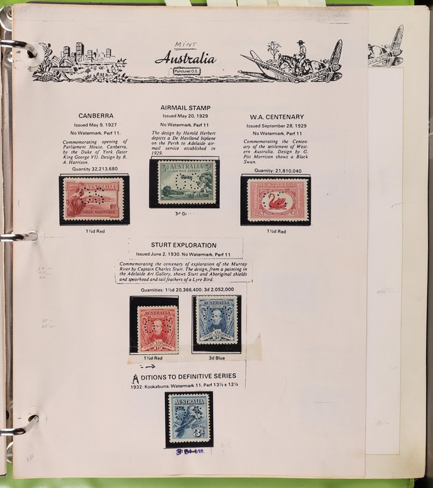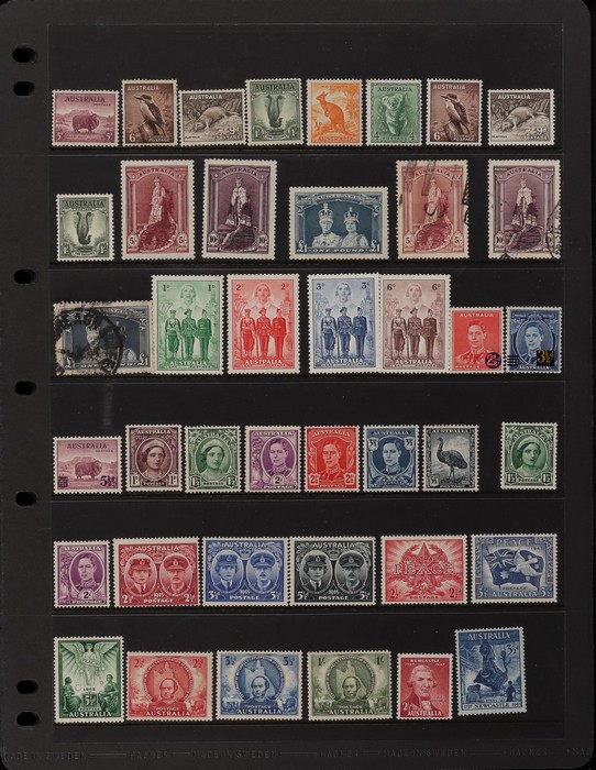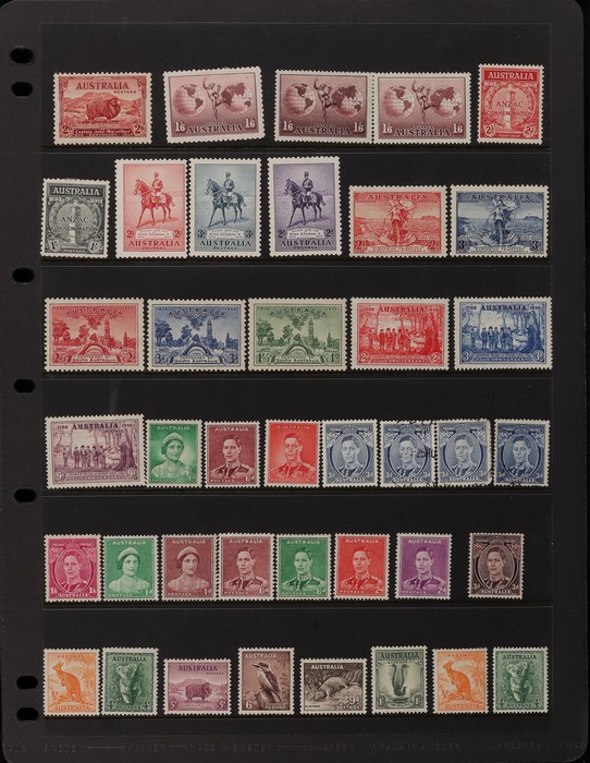 156 image1913-75 collection in SG Devon loose leaf album with Kangaroos (60) to 10/- inc 1st wmk to 1/- inc 1d, 2d, 1/- wmk inv, 2nd wmk set to 5/-, 3rd wmk to 5/- inc 2/- maroon. SM to 2/- inc 6d opt OS & CofA to 5/- inc 6d opt OS. Large OS Perfin set (ex 2½d) to 1/- cat $650. Small OS to 2/- maroon F-VFU, plus 10/- 3rd wmk CTO. All G-F/VFU, ACSC cat $3960. 1913-35 KGV set of 72 (cat $1200) inc 1d red Die III, 1d green Die II, 4½d Die II & OS opts to 5d. Also perf OS (22) to 1/4 (cat $900) inc 2d brown, 4d lemon & 4½d Die II. 1914 Kookaburra 6d Engraved. 1927-30 Commems perf OS set of 6 VFU (cat $175). 1931-37 Commem sets comp inc 1931 Kingsford Smith trio blks of 4 M/MNH & 2d, 3d opt OS. Bridge set of 6 to 5/-. KGVI appears comp inc 1937 3d blue Dies set of 6 M (cat £500) inc 'white wattles'. 1938 Robes set 5/-, 10/-, £1 M & U, 1946 BCOF opt set to 5/- UN, 1949 Arms to £2 U, plus 10/-, £1, £2 opt SPECIMEN. Comprehensive QEII Pics to 1975 inc 1959 Pics to 5/- Cattle white paper MNH, 1963-64 Navigators set of 6 & decimal mostly MNH Pics inc 1966 Defs to $4 & better early 1970s Commem sets. Mostly F-VFU/M/MNH. ACSC cat $9000. SG cat £5300 = A$10,600. (980) (Image1) (Image2) (Image3) (Image4) (Image5) (Image6) (Image7) (Image8) (Image9) (Image10) (Image11) (Image12) (Image13) (Image14) (Image15) (Image16) (Image17) (Image18) (Image19) (Image20) (Image21) (Image22) (Image23) (Image24) (Image25) (Image26) (Image27) (Image28) (Image29) (Image30)