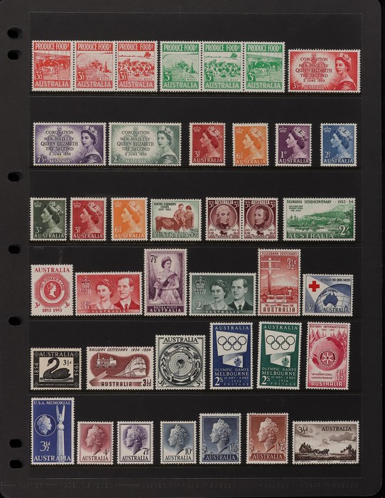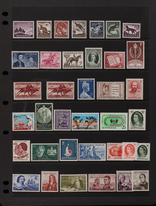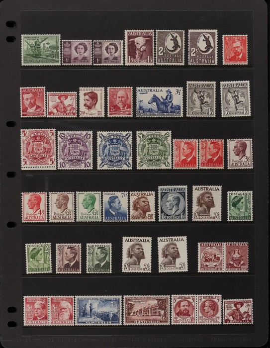 153 image1913-65 MNH/M/U collection in Seven Seas album with Kangaroos 1st wmk to 1/-, 2nd to 2/-, 3rd to 5/-, SM wmk to 2/- & CofA to 10/-, plus £1 grey Telegraph Puncture, all G-FU. KGV set of 72 inc 1d red Die II, Die II, 1d green Die I-II pr, 4½d Die II & OS opt to 5d brown F-VFU, plus perf OS near comp (51) with single wmk to 1/4, no wmk 1d & 1½d, SM wmk perf 14, 2d, 4d, 4½d & 1/4. SM wmk perf 13½x12½ (12) to 1/4, G-FU inc odd CTO (ACSC cat $1500). 1914 Kookaburra 6d Engraved CTO, 1927-30 Commems set of 6 perf OS, 1928 Kookaburra 3d M/sheet M. 1931-37 Commems & Pics F-VFU with OS opt set of 6 to 1/- Lyrebird set. 1934 VIC Cent & Macarthur sets, 1935 ANZAC 1/- & KGV SJ to 2/-, 1936 SA & 1937 NSW Sesqui set. KGVI 1937-50 near comp M inc 3d blue 'white wattles' Robes set to £1, plus 10/- opt SPECIMEN. 1940 AIF set & 1949 Arms set to £2. 1951-65 Pics, Defs & Commems comp inc 1950 KGVI Defs to 2/6, 1959-61 Pics to 5/- Cattle white paper, 1964 Navigators set of 8 to £2 & 1964 Birds to 3/-. MNH/M/U as noted, ACSC cat $6850, plus extra for £1 Kangaroo. (450) (P) (Image1) (Image2) (Image3) (Image4) (Image5) (Image6) (Image7) (Image8) (Image9) (Image10) (Image11) (Image12) (Image13) (Image14) (Image15) (Image16) (Image17) (Image18) (Image19) (Image20) (Image21) (Image22) (Image23) (Image24) (Image25) (Image26) (Image27)