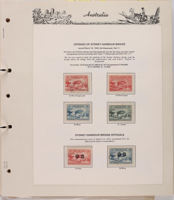 157 image1913-75 near comp collection in Seven Seas hingeless album with Kangaroos 1st wmk to 2/-, 2nd wmk to 2/-, 3rd wmk to 2/- brown, SM wmk to 5/- & CofA wmk to 5/- inc 6d opt OS, plus 10/-, £1, £2 opt SPECIMEN. KGV comp (retail $750) inc single wmk 1d Die III & 4d lemon, SM wmk perf 14 to 1/4, 1d green Die II, 4½d violet Die II & opt OS set to 5d. 1914 Kookaburra 6d Engraved. 1928 Kookaburra 3d M/Sheet with pale Exhibition cancel. 1931-32 OS opt set of 6 to 1/- inc Kingsford Smith 2d, 3d. 1932 Bridge set to 5/- & all other 1930s high val Commem sets F-VFU. 1937 Robes to £1 thick & thin papers. 1949 Arms set to £2. 1953-75 QEII comp inc 1964 Navigator set of 8 to £2 King, 1966 Defs to $4 Navigator, 1974 Paintings to $10 & all other Pic/Commem sets inc 1971 Christmas 7c blk of 25. A well balanced, neat, mostly F-VFU collection, nicer than most. . ACSC cat $5500. SG cat £3300 = A$6600. (670+) (P) (Image1) (Image2) (Image3) (Image4) (Image5) (Image6) (Image7) (Image8) (Image9) (Image10) (Image11) (Image12) (Image13) (Image14) (Image15) (Image16) (Image17) (Image18) (Image19) (Image20) (Image21)