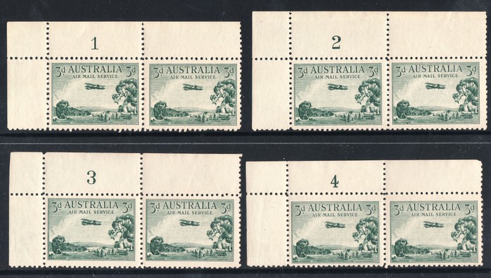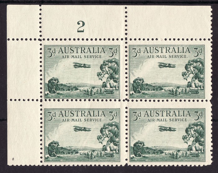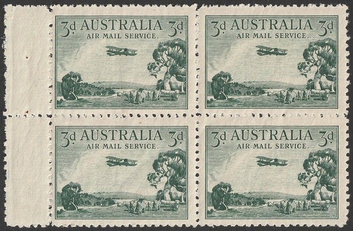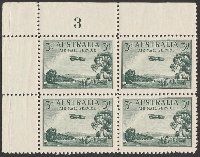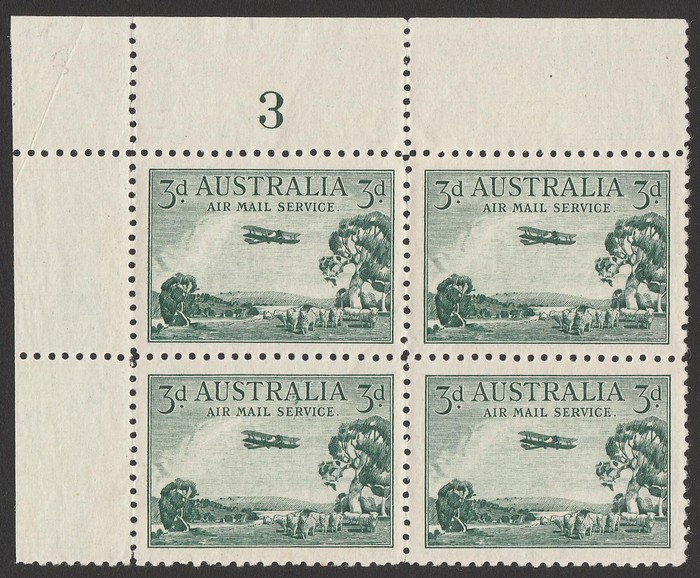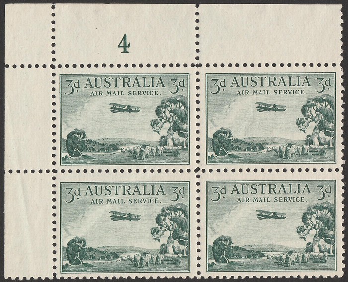 green type A booklet plate stamps, variety 'long wing to plane' in blk of 4. VF 2 MNH (inc variety)/2 MLH. SG 115b cat £500 M, should be double £1000 = A$2000 MNH. ACSC 136d cat $1750 with additional stamps. (4) (P) (Image1)
