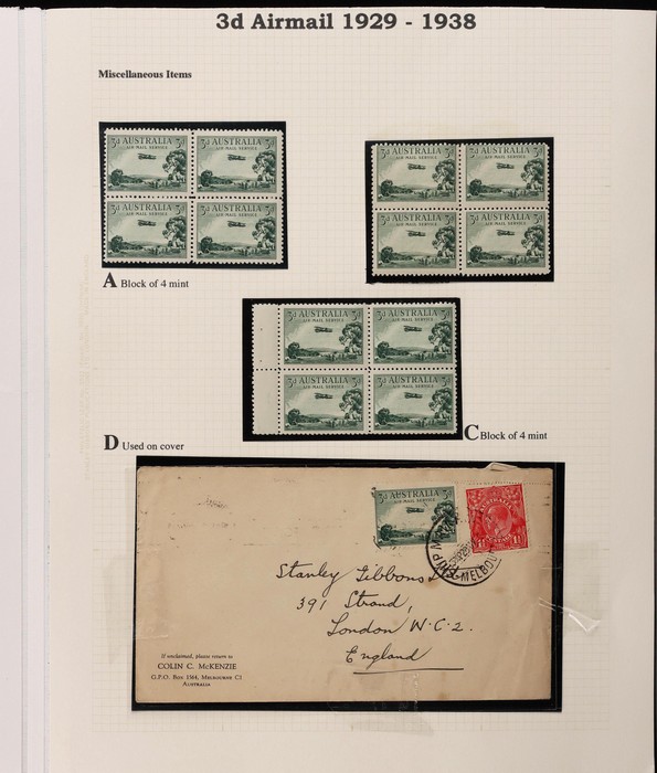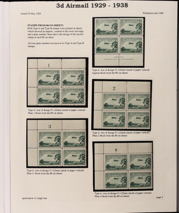 dull green collection on pages inc type A blks of 8 & 2 blks of 4, booklet pane of 4 with dot in upper margin, plate blk of 4 - no 4 cover to UK with 3d & 1½d red KGV & type B single. F-VF MNH. SG 115(var). ACSC 134/135(var) cat $1630. (26 + 1