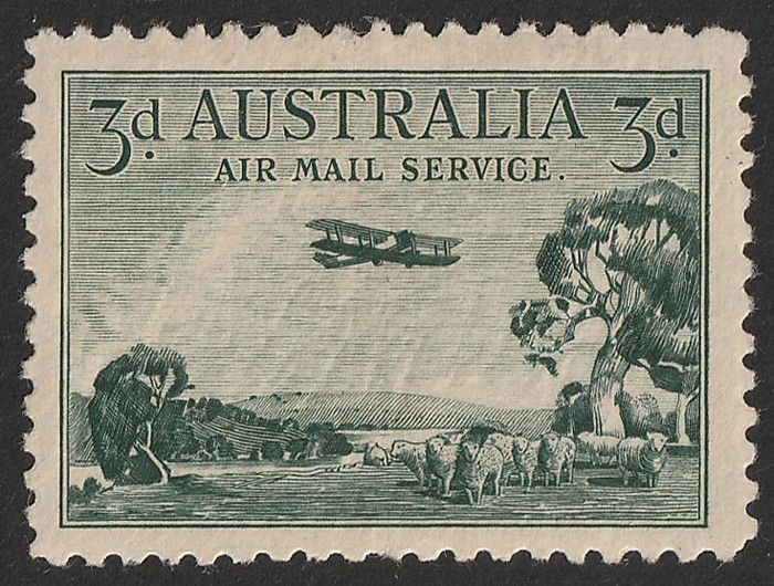 1929-38 Airmail 3d green booklet plate stamp type A, variety 'long wing on plane'. F MLH, suntanned gum. SG 115b cat £500 = A$1000. ACSC 136s cat $1000.