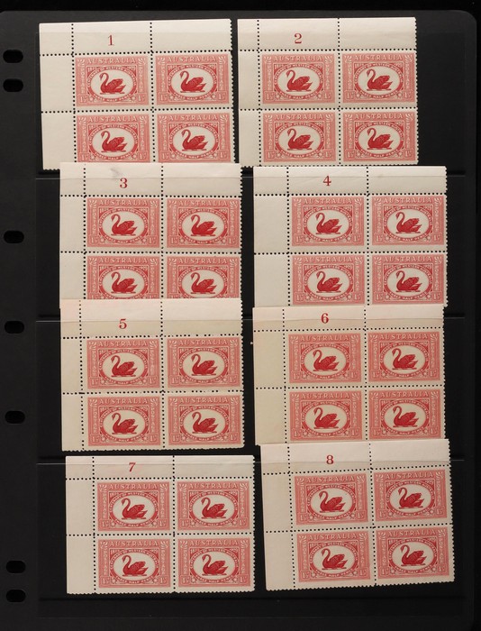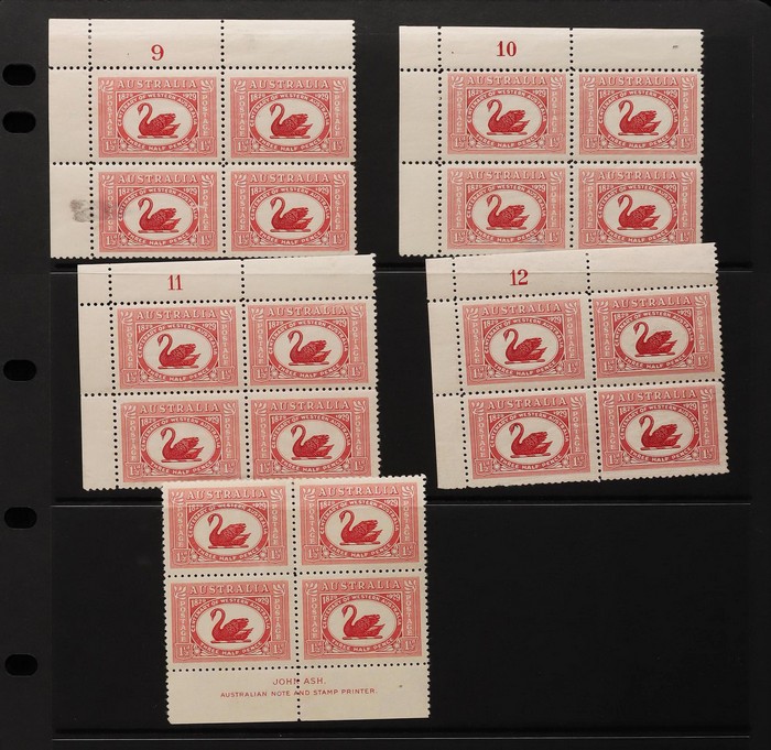 WA 1½d Swan complete set UL Plate numbers in 1-12 cnr blks of 4 plus Ash imprint blks of 8 (2) with the 2 diff re-entries (ACSC 138e&g). Fresh F-VF MLH/MNH. SG 116(var). ACSC 138z, zm & za cat $1000+. Comprehensive collection. (68). (Image1) (Image2)