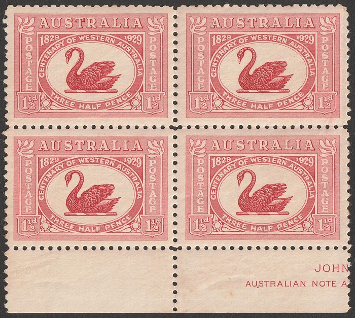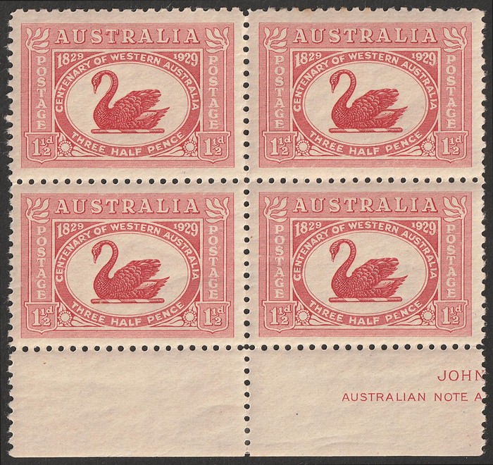 WA 1½d Swan part imprint blk of 4, upper right stamp with re-entries to Swans Neck & T of AUSTRALIA. VF MNH. ACSC 138Ae cat $225. SG 116a cat £60 as M, should be at least double, £120. (Image1)