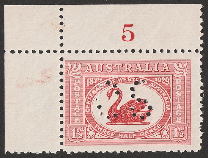 WA 1½d Swan perf OS UL cnr Plate No 5, fresh MNH. ACSC 138 ba zd(var). Scarce. (Image1)