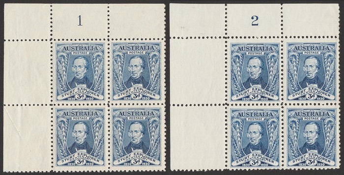 1½d carmine red complete set plate nos 1-8, blk of 4; 3d blue plate blks of 4, plate nos 1 & 2, Ash imprint blks 1½d & 3d Ash imprint blks of 4. Fresh VF MLH-MNH. SG 117-118(var), ACSC 139-40 cat $400+. (48) (Image1) (Image2)