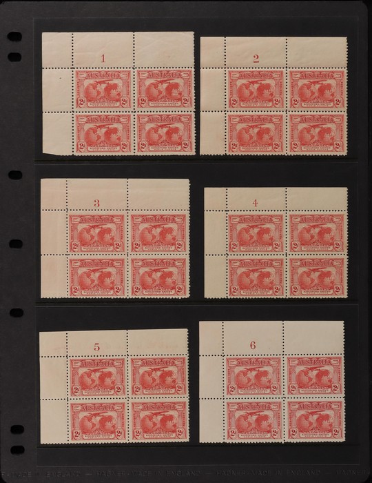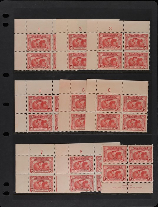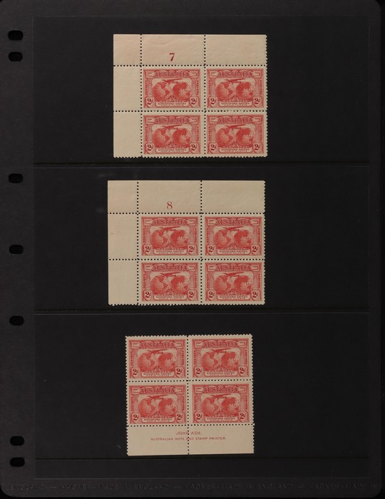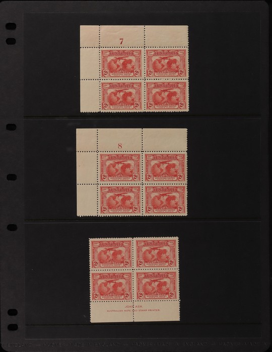 Smith 2d carmine-red plate blks of 4, nos 1-8 & Ash imprint blk of 4. 1931 Kingsford Smith 3d blue plates no 1 & 2 blks of 4 & plate 2 blk of 6, with plane dropping mailbag (SG 122a cat £150), also Ash imprint blk of 4. Fresh F-VF MNH/MLH. SG