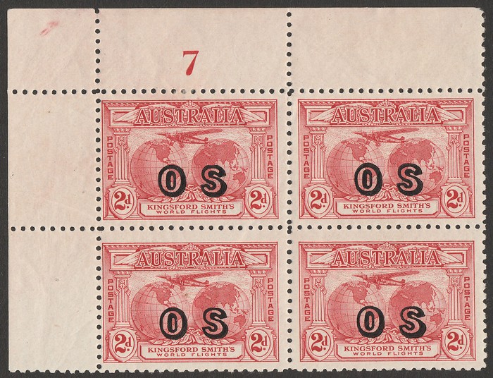 Smith 2d red opt OS, UL cnr marg plate no 7 blk of 4. VF fresh 1MLH/3MNH. SG O123(var), ACSC 141(OS)zf cat $3750+ for M, plus premium for the 3 MNH stamps. Very rare genuine opt plate blk. Certificate can be obtained on request. (P) (Image1)