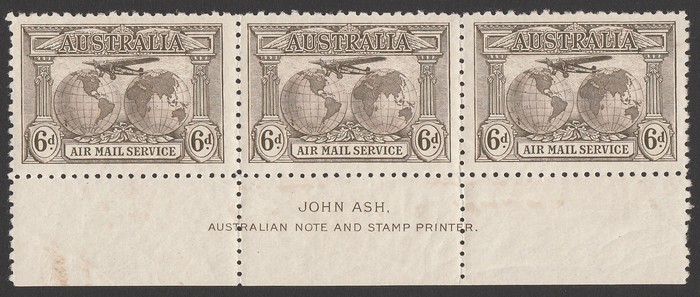 brown, lower part sheet of 20 with Ash imprint at centre base. VF MNH, some perf separations & sl darker gum. SG 139 cat £440 as M singles, should be at least double, £900. ACSC 143zd cat $1125. (20) (Image1)