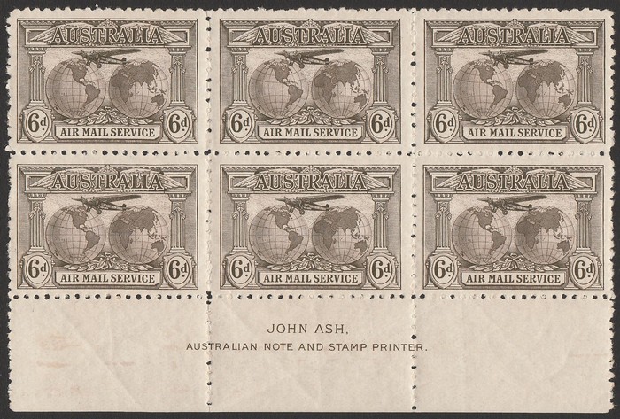 dull brown. Plate 1 Ash imprint blk of 6. Traces of light hinging on upper outer stamps. F-VF MLH/MNH. SG 139A ACSC 144A zd cat $275. (Image1)