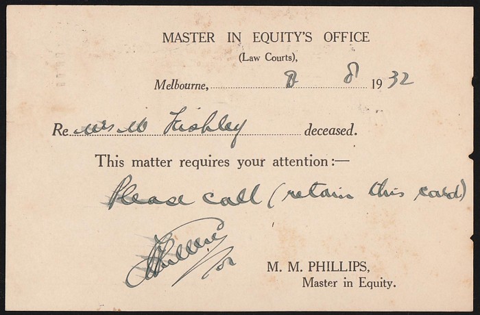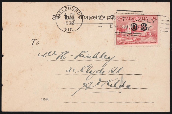Engraved opt OS, on 1932 (11 Aug) OHMS Master of Equities Office printed card with details written in, pmk dated 6pm indicating paying 2nd class rate + 1d late fee, used at Melbourne, minor tones, very scarce on cover let alone on card. (p) (P) (Image1) (Image2)