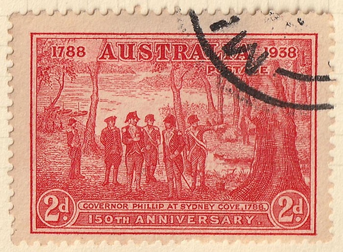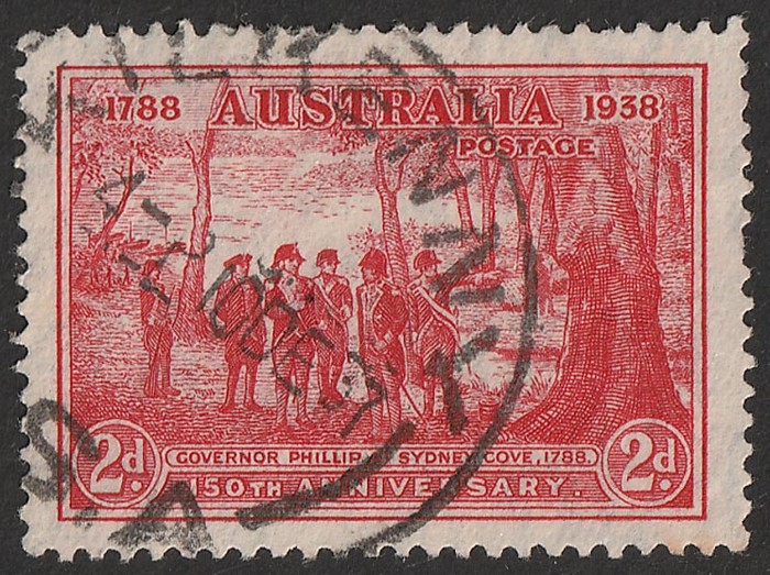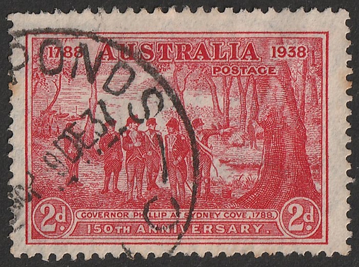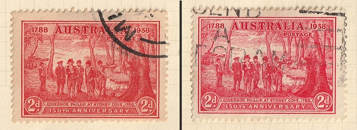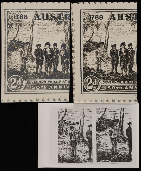 1937 NSW Sesqui Centennial 2d scarlet showing the development of the variety 'pantaloon flaw' (ACSC 175f) & 'retouch - States I & II' (ACSC 175fa & fb) with illustration & notes on the flaw development. F-VFU. SG 193. ACSC 175f-fb cat $600. (4) (P)