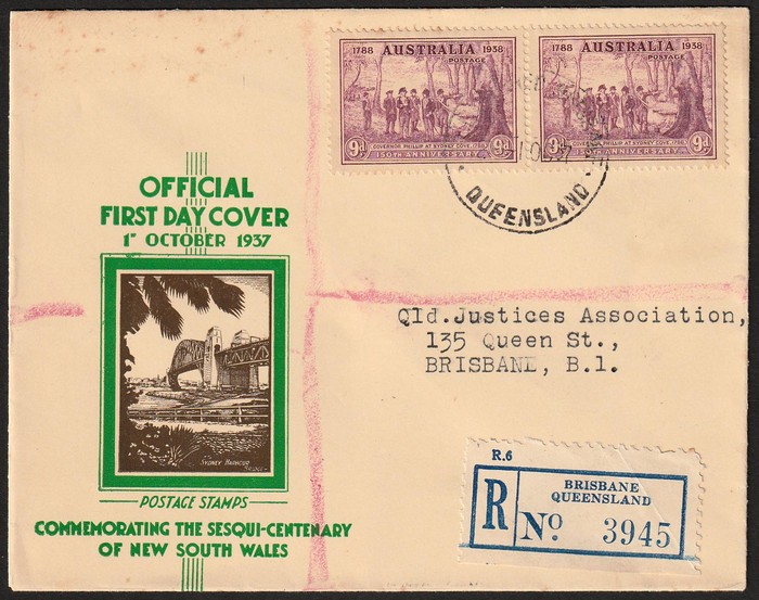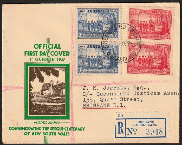 2d-9d prs on 2 FDC tied by 'Brisbane 1 OC 37' cds. ACSC 175-77y. (Image1) (Image2)