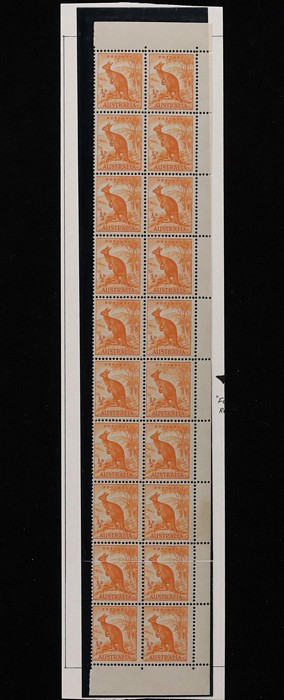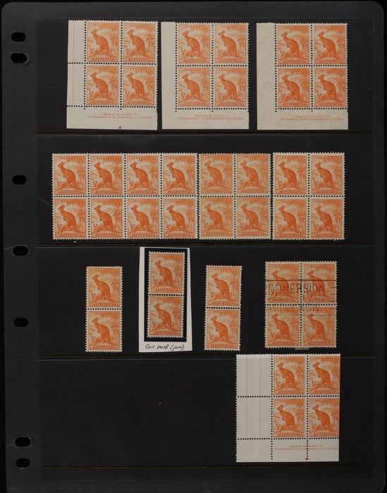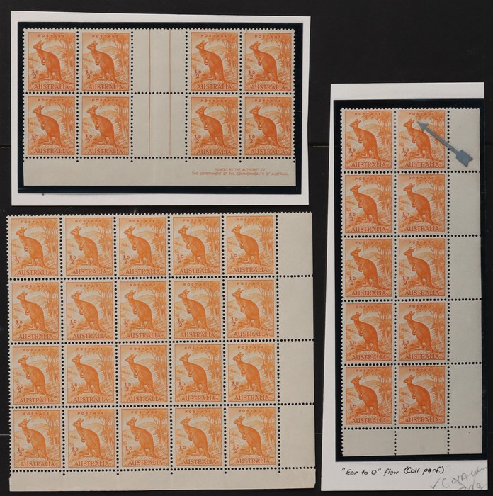 Kangaroo ½d orange CofA wmk & no wmk collection inc shades, blks 10-20, several with varieties inc 'coloured flaw from right ear to O' (ACSC 179g), coil prs, By Authority imprint blks of 4, perf pip blk of 8 etc. F-VF MNH, about 20% MLH. SG