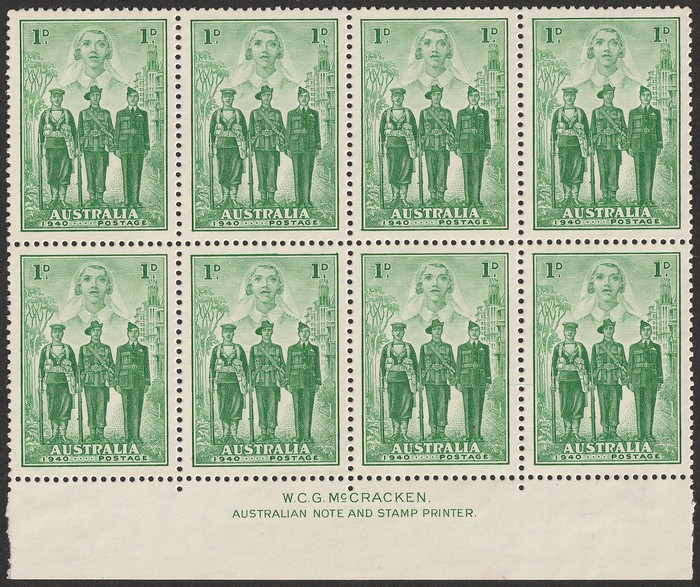 McCracken imprint blk of 8 with varieties 'kiss curl on nurse (ACSC 218g) & 're-entry to top frame & inscriptions at bottom' Imprint blk is VF MNH. SG 196(var). ACSC 218zb cat $225. (8). (P) (Image1)