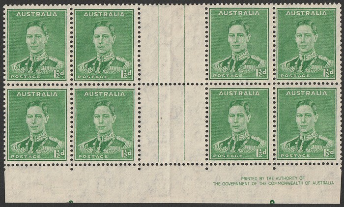 1½d green by Authority imprint blk of 4 cracked plate State I, gutter blk of 8. Fresh F-VF MLH. SG 183(var). ACSC 186zi cat $400. (8). (P) (Image1)
