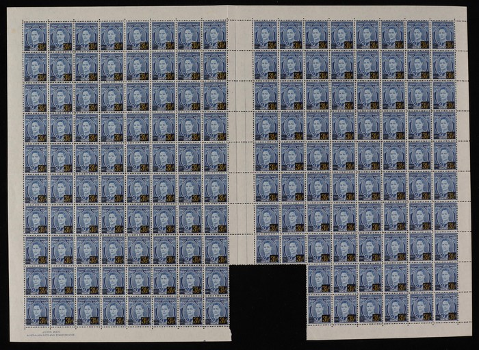 3½d opt on 3d blue near comp sheet of 156 (missing central imprint) with LL Ash imprint cnr blk of 4. Couple hard to see light gum spots, fresh MNH. SG 201 cat £390. ACSC 323 z cat $320. (Image1)