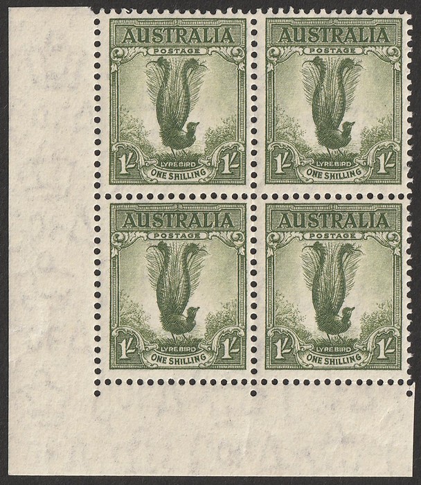 Lyrebird 1/- perf 14¾x14, CofA wmk no imprint left cnr blk of 4. Fresh F-VF 3MNH, 1MLH. SG 230d(var). ACSC 209z cat $225. (4). (Image1)