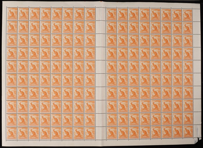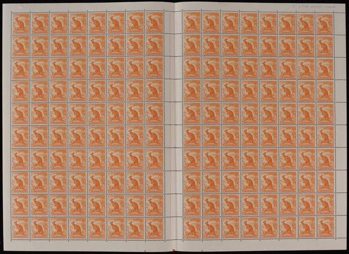 sheet of 84 with perf-pips at left & Authority imprint al LL cnr & ACSC listed variety 'spot in margin under L of Postal' (Pos 14/3). Moderate overall light toning with yellowish gum. SG 232(var), cat £50+, ACSC 276 b d z cat $255. (84) (Image1)