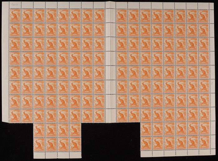 ½d Kangaroo no wmk coil perf near comp sheet of 160 (missing imprint blks of 4 & 8 with central gutter) plated as Sheet B with ACSC variety 'ear to O flaw' (pos R 6/8, cat $75 x 3 for coil perf, $225) & stamp R 2/3 cpl stamps with rev spots