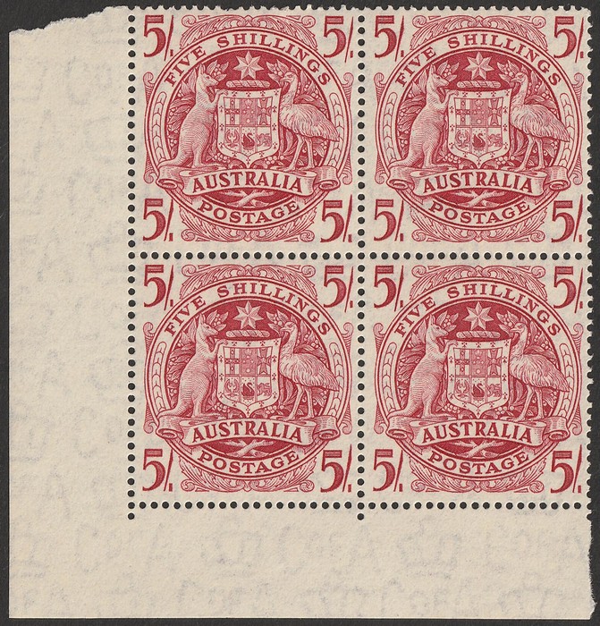 Carmine no imprint left cnr blk of 4. Fresh VF MNH, 1 ribbed perf. SG 224a(var). ACSC 268zb cat $175. (4). (Image1)