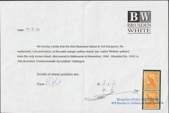 Kangaroo ½d Bright orange yellow no wmk, perf 15x14 coil pr. Fresh VF MNH. SG 228(var). ACSC 180C cat $650. Rare shade. 1997 Brusden White photo-cert. (2). (P)
