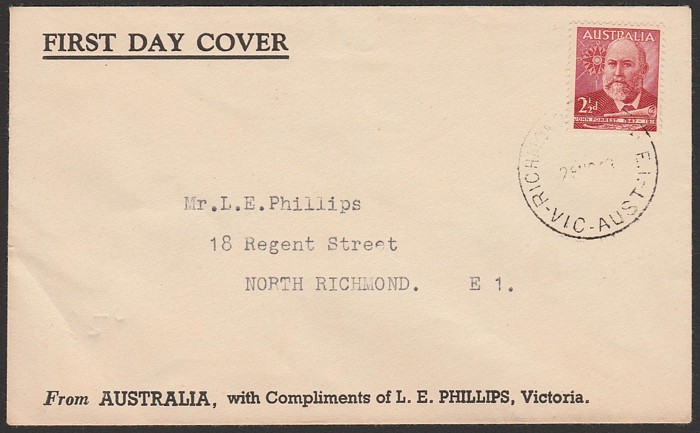 2½d on LE Phillips generic FDC with indistinct 'Richmond North/VIC' cds. SG 233(var), ACSC 277. A spectacular appealing non pic FDC of high rarity! (Image1) (Image2)