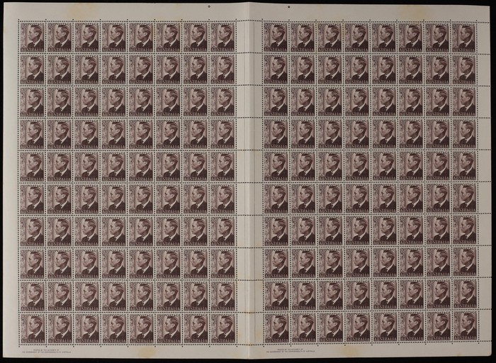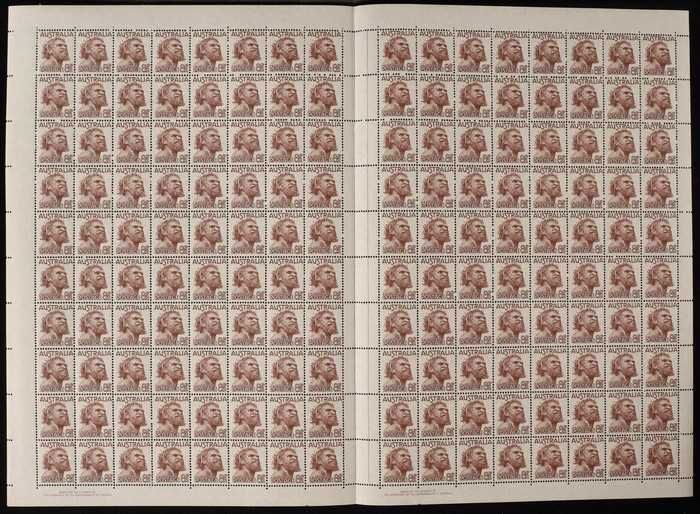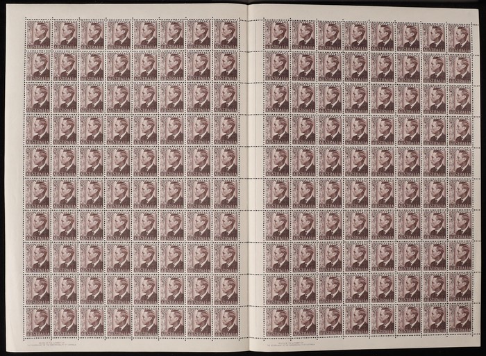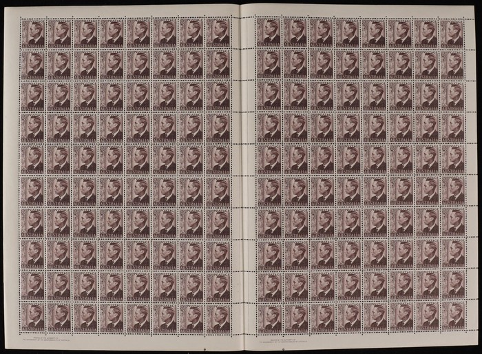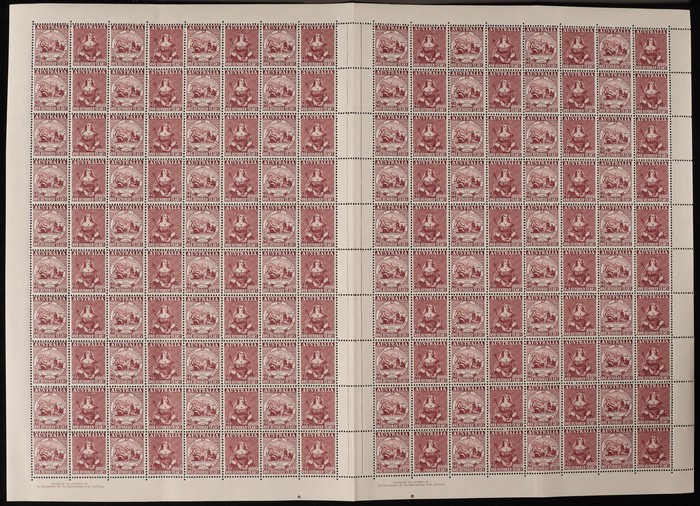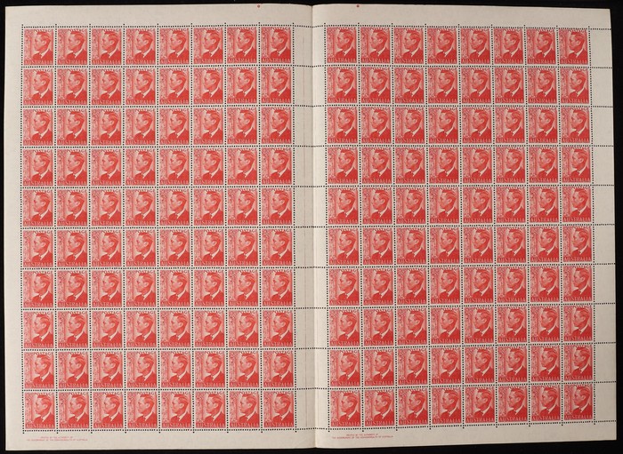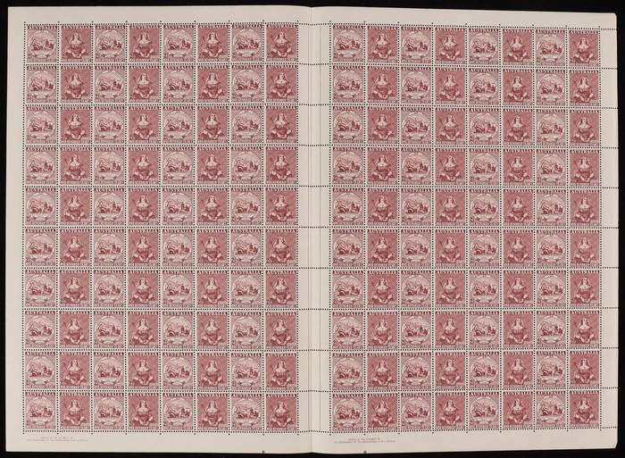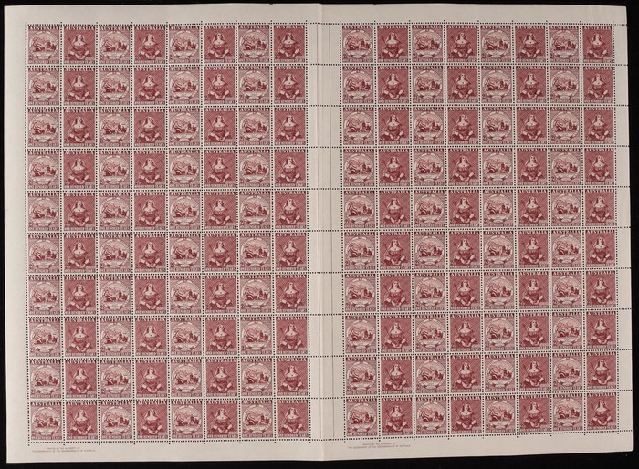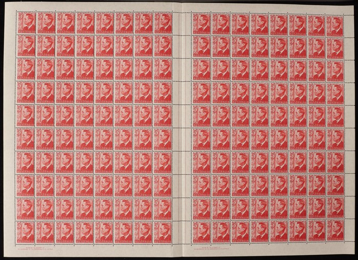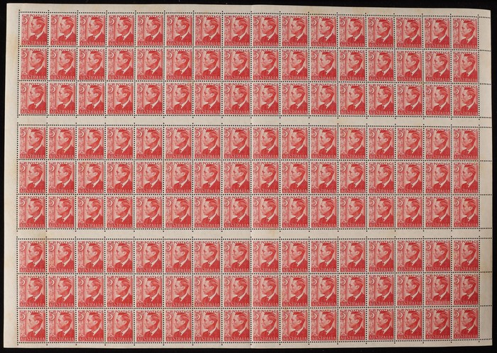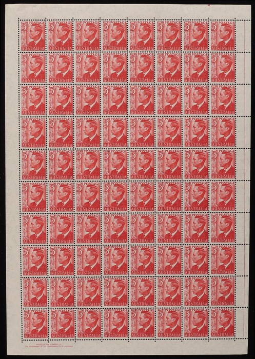 scarlet sheet of 160 with both Authority imprints. Scattered light tropicalisation areas, o/w mostly fresh MNH. SG 235(var), ACSC 251zj zsk cat $340. (160) (Image1)