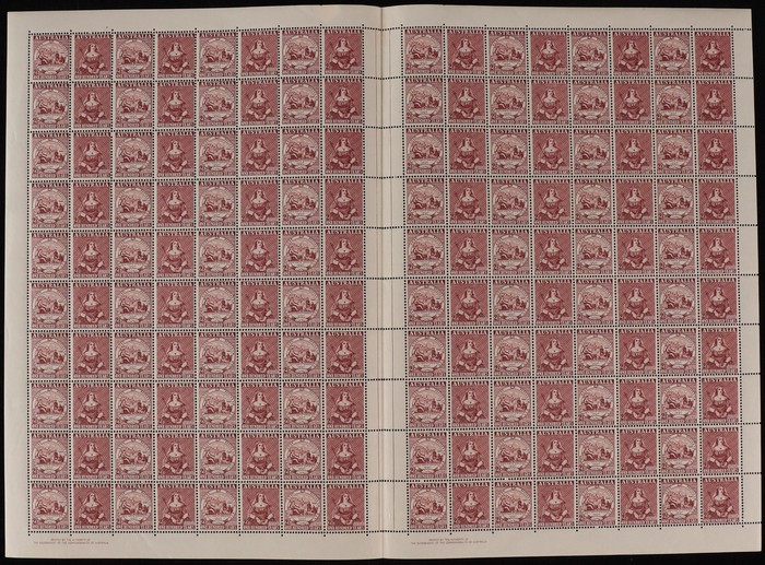 Stamp Centenary 2½d pr, sheet of 160 with perf-pips at centre top & both Authority imprints. Crisp centre fold plus hinge remains in left selvedge. Fresh MNH. SG 239a(var) cat £112+, ACSC 278, 279b zf zg cat $375. (160) (Image1)