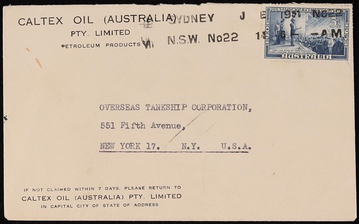Federation Anniv 5½d blue tied by Sydney NO 22 1951 pmk. To USA. SG 243(var). ACSC 282 cat $300 for solo franking. (Image1) (Image2)