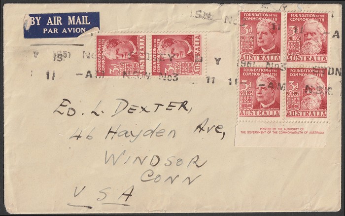 imprint blk of 4 plus vert pr on Airmail cover to USA, pmk Sydney hand held roller cancel. A similar cover realised $360+ in April 2010 Prestige Melbourne sale. (Image1)
