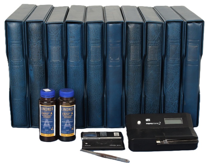 ring binders with matching slipcases 'as new' (10). Few stamp accessories inc tweezers, electronic perf gauge, magnifying glass & 2 unused sealed bottles of Linder mildew stain remover (retail $33 each). VGC. Replacement retail $600+. (Image1)