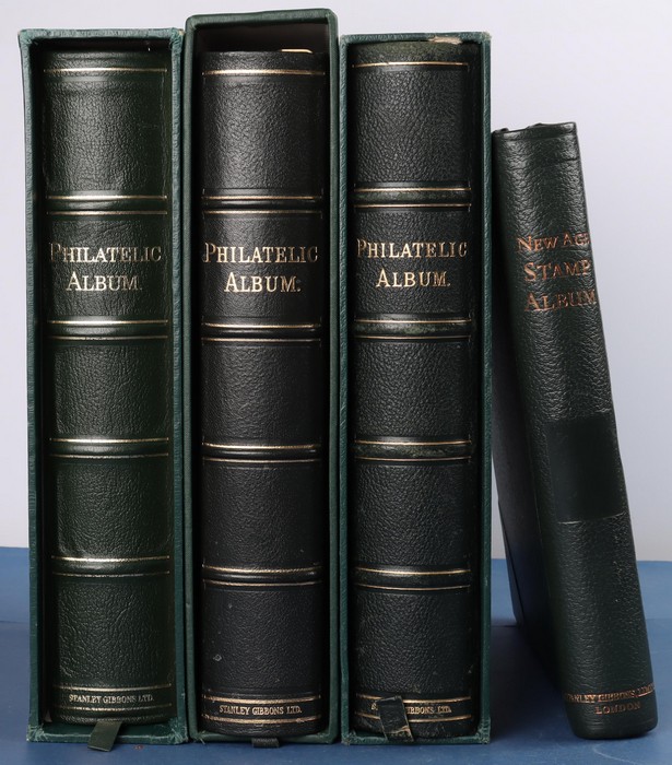 Philatelic album (c1940-50s) (3) with slipcases & 20-40 new pages in ea. 1 VG, 2 GC plus New Age binder with few pgs & non-matching slipcase. Fine condition as new. Retail $900-1200. (3) (Image1)