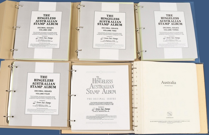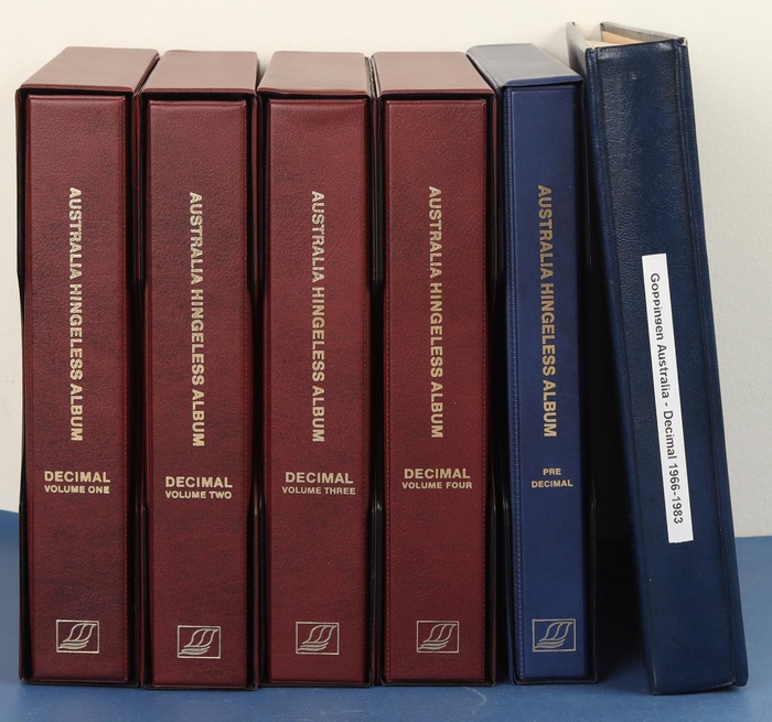 hingeless albums with slipcase, pre-decimal 1913-66 & decimal volumes 1-4, 1966-2011, also KABE album Australia decimal issues 1966-83, very few stamps. VF. Retail $1300+. (6)