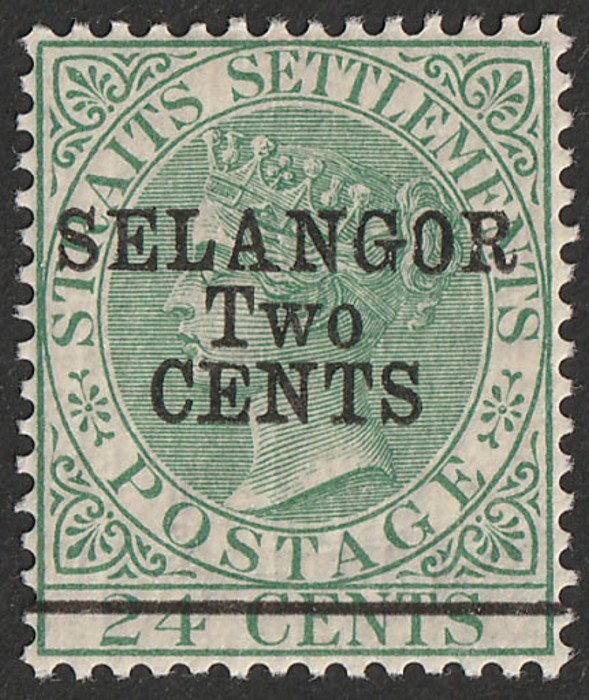 'SELANGOR TWO CENTS' opt QV 24c green, opt SG type 39. Superb fresh MLH. Scott 23 cat US$225. SG 48 cat £300. Only 600 of this type printed. (P) (Image1)