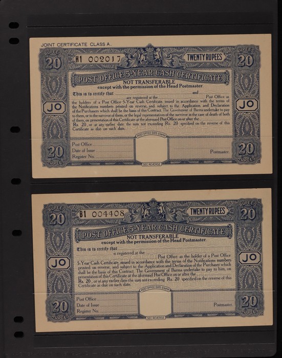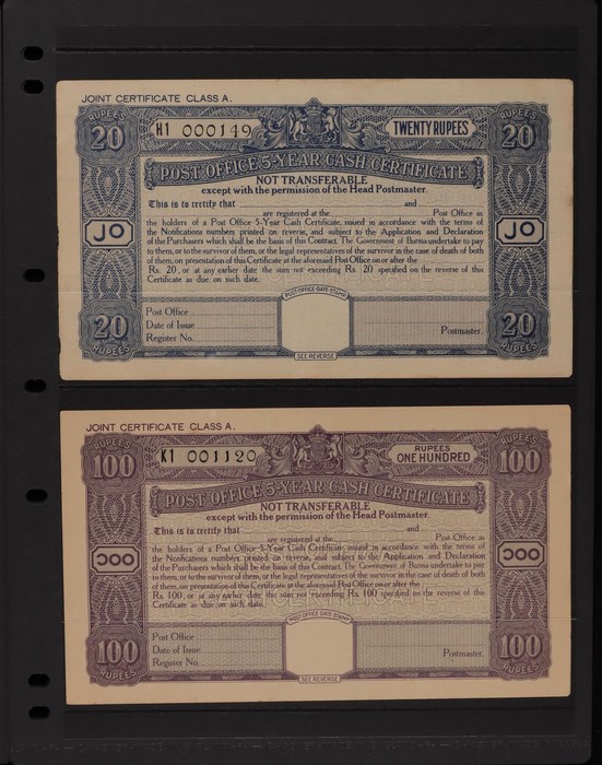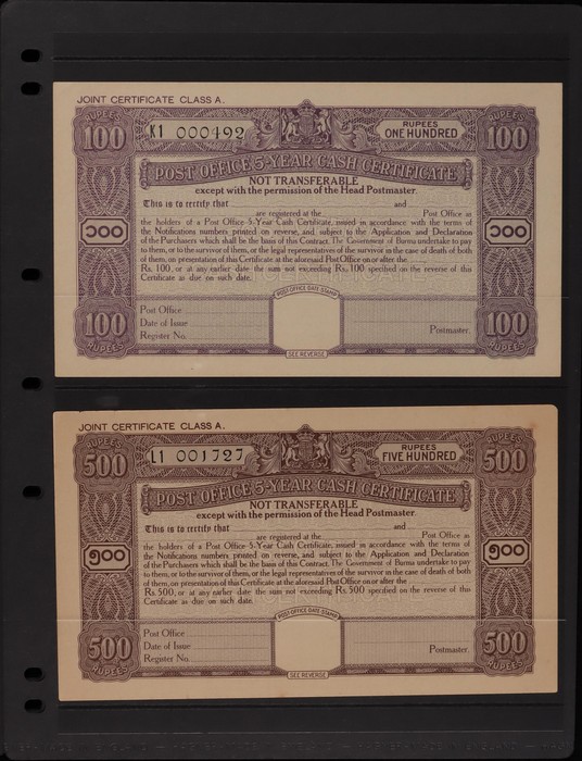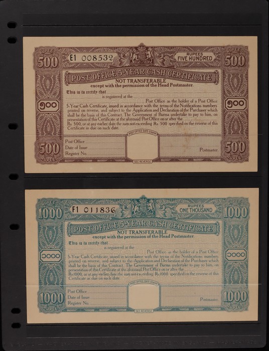 349 image1945 Burma War Savings 'Post Office 5-Year Cash Certificates' all diff, inc watermark error 'GOVT OF INDIA & stars' on 10R series A1, 20R series H1 & 100R series K1, then all correct wmk 'GOVT OF BURMA & elephant' 10R series A1, 20R series B1, 20R series H1 with 'Joint certificate Class A' imprint at top, 100R series K1 with 'Class A' imprint, 500R series E1, 500R series L1 with 'Class A' imprint, & 1000R series F1. All large banknote size format, with British Burma coat of arms at top middle. Nice UNC/aUNC. Lesser selection sold for an average of £36+ each at a London auction in 2010, so would make these £360+. Very scarce group. (10) (Image1) (Image2) (Image3) (Image4) (Image5)