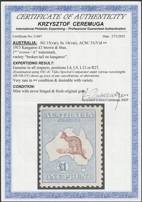 for normal, plus 15% for variety = est $20,000+. Very rare genuine MNH & desirable with variety. 2025 Ceremuga AIEP photo cert. (P) (Image1) (Image2)