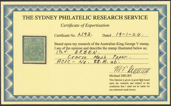 coarse mesh paper. F-VF fresh MNH. SG 62(var). ACSC 95Eac cat $300 for M, should be at least double, $600 MNH. 2024 Drury photo cert. (P) (Image1) (Image2)