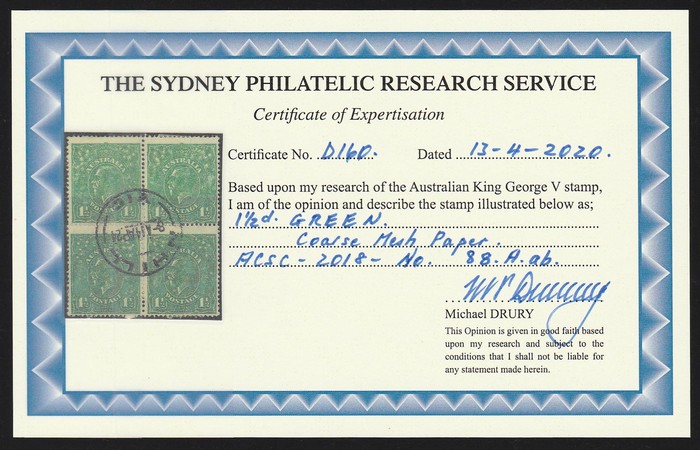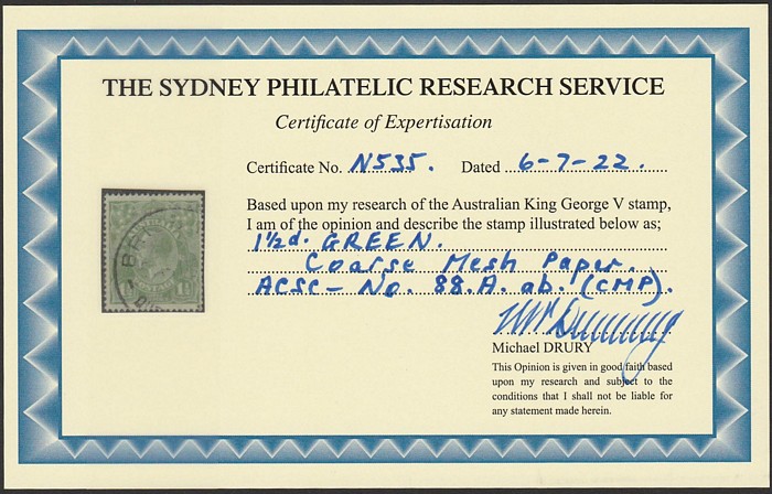 OS coarse mesh paper. Part 'Millicent' SA cds, VFU. SG O70a cat £200 x2 for perf OS. ACSC 88Aba cat $300, should be at least double, $600 perf OS. 2022 Drury photo cert. (P)