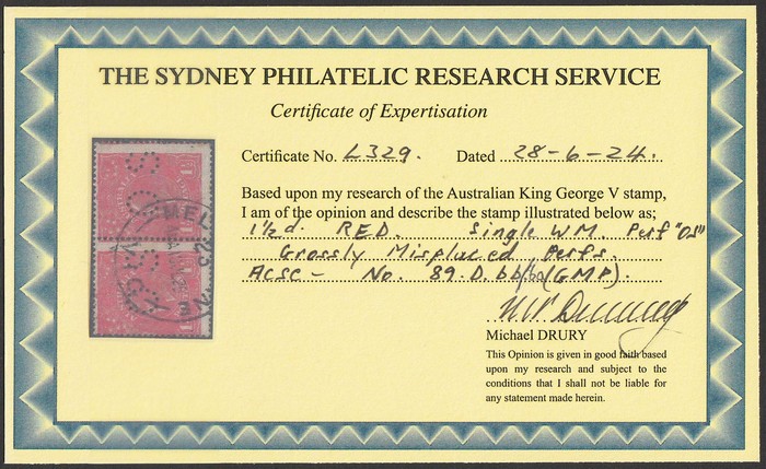 thick coarse mesh paper. Light 'Victoria' machine cancel. F-VFU. ACSC 95Eac/ba cat $400 for Official Perfin. 2024 Drury photo cert. (P) (Image1) (Image2)