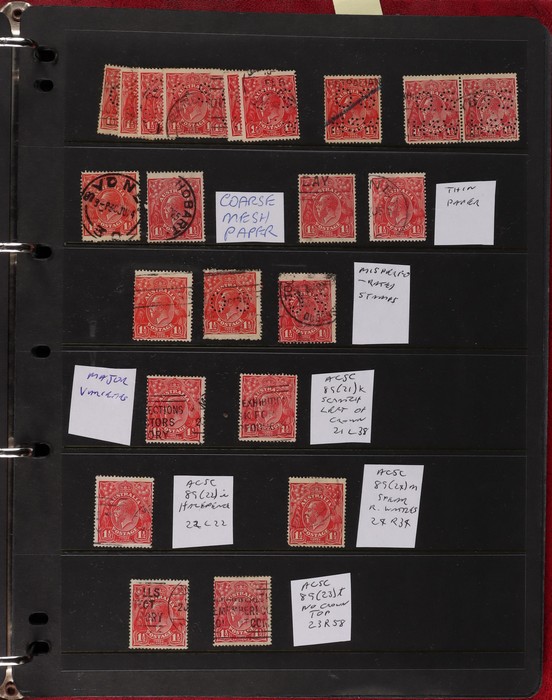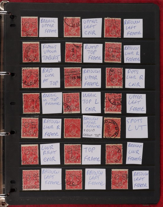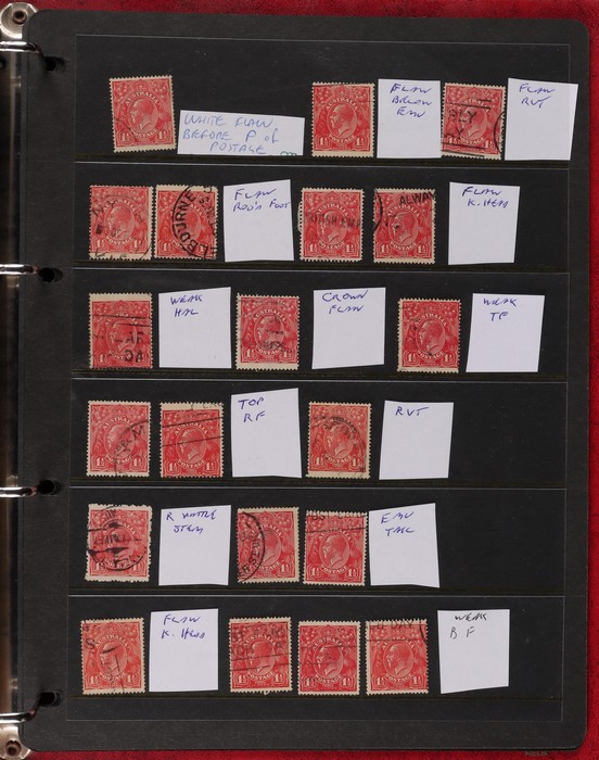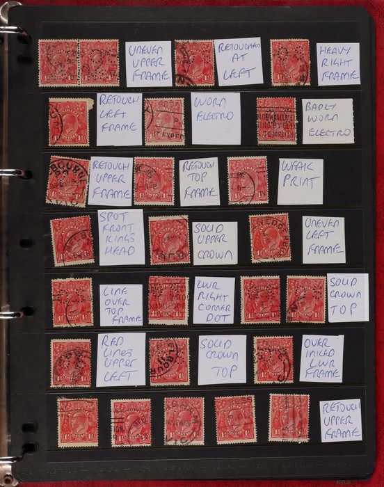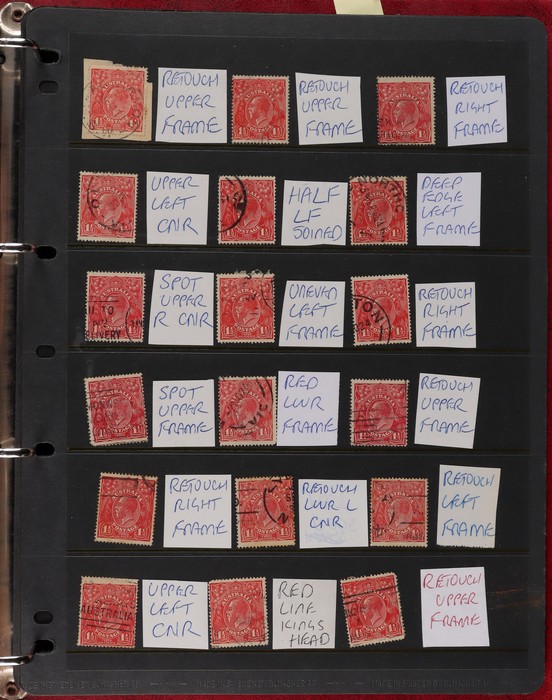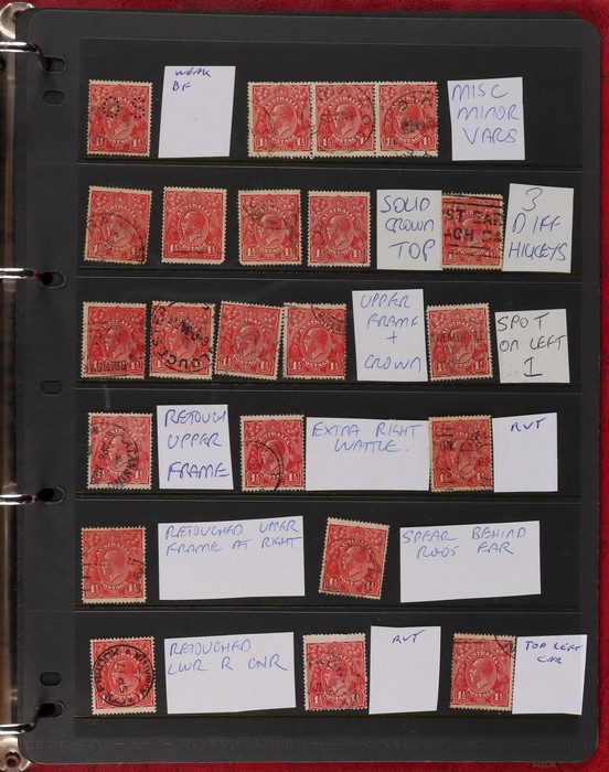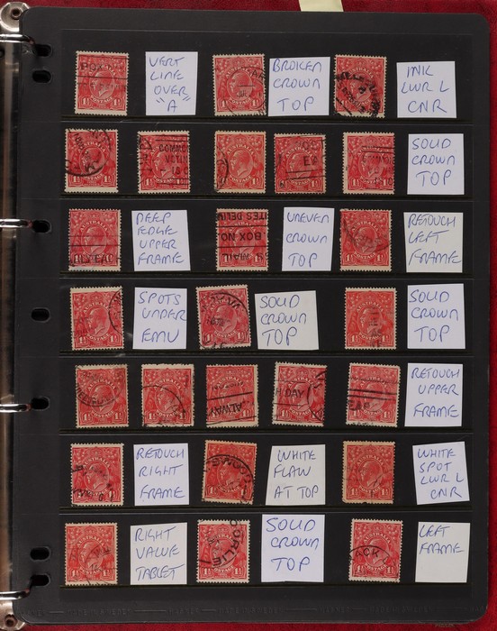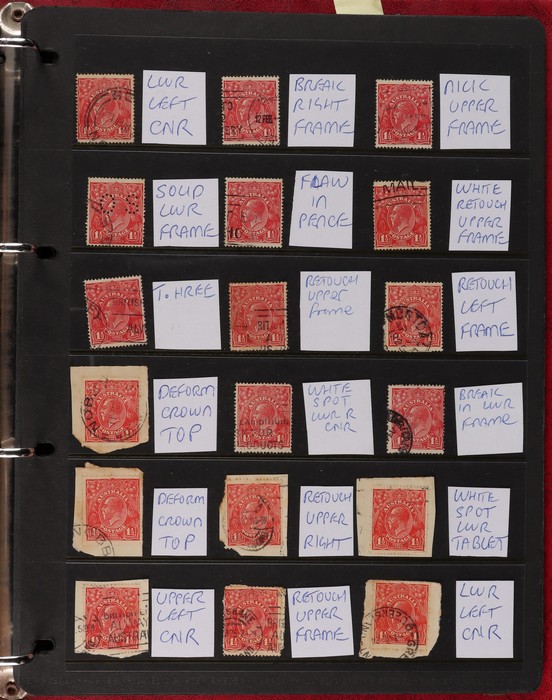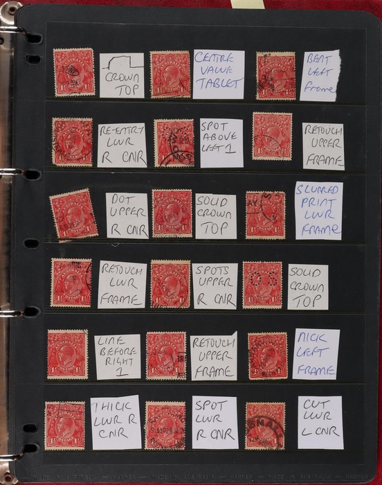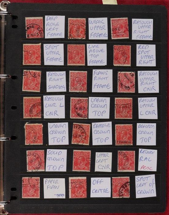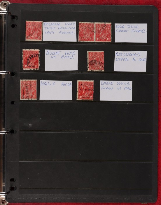 pale semi surfaced paper) perf OS electro 8A top right marginal blk of 30, plated as 8AR1-130 with 5 major varieties 8AR11 'flaw emu's head' (ACSC 95G(8A)i), 'thick right frame' (95G(8A)j), 8AR20 'flaw on A' (95G(8A)k), 8AR23 'flaw on crown'